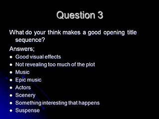 We found out that a lot of people believed that having good visual effects is the most important factor to have in an opening sequence. One factor that people enjoyed the least in an opening sequence is text and dialogue. From this, we concluded as a group, that we should have as little text and dialogue as possible in our film. As well as special effects, people believed that music and action is important too. So we would have to make the music relevant to the movie and make it flow with the sequence. The ending of the sequence should have a cliff hanger to make the audience wanting to know more. In addition to this, we concluded from our results that our opening sequence should be a crime/ urban drama because the target audience is between teenagers and 20’s.
